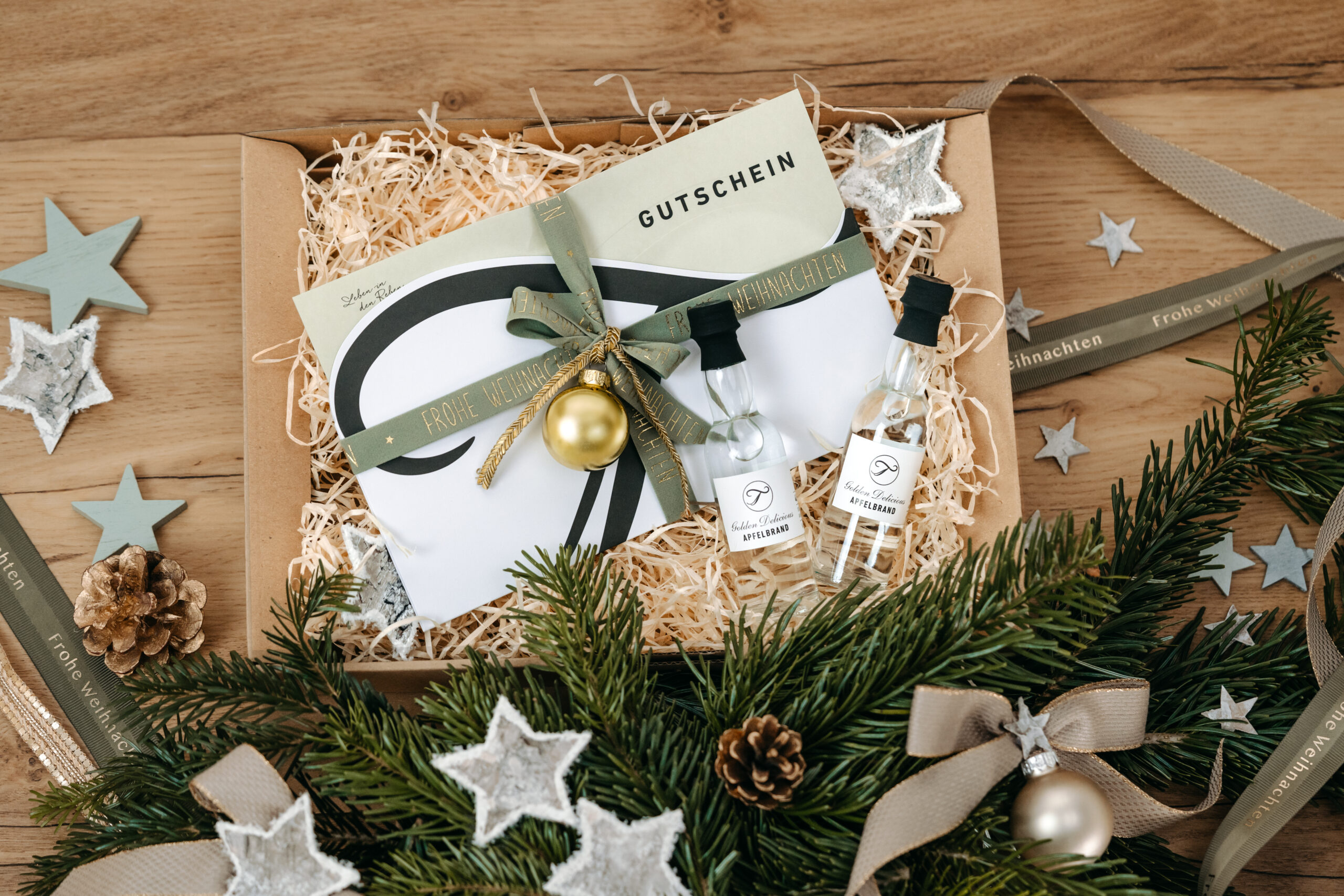 Gutschein für ein romantisches Picknick am Rebkogl. www.am-rebkogl.at Der Gutschein wird Weihnachtlich im Naturkarton mit zwei Flaschen Edelbrand (40 ml), getrocknetem Heu, Heublumen und Schleife verpackt.