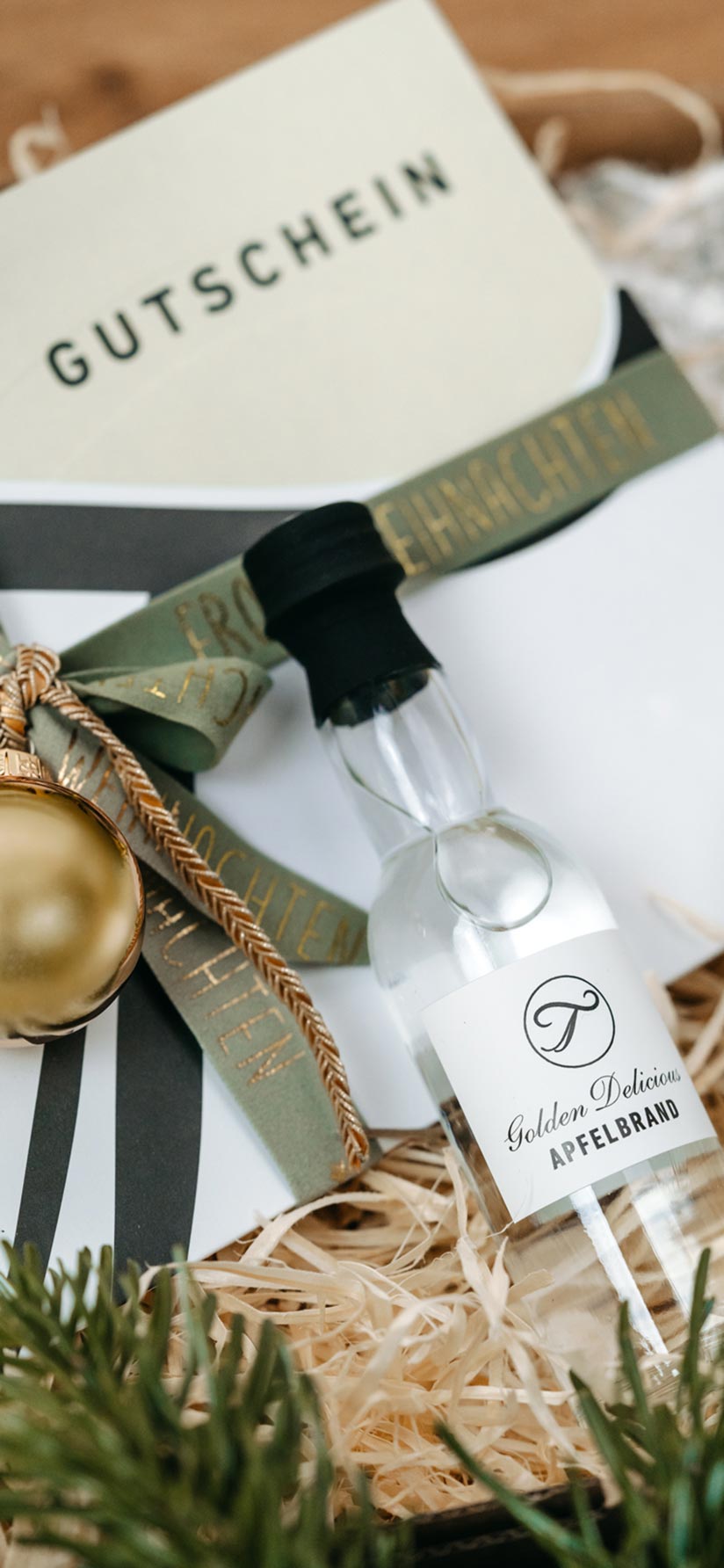 Gutschein für ein romantisches Picknick am Rebkogl. www.am-rebkogl.at Der Gutschein wird Weihnachtlich im Naturkarton mit zwei Flaschen Edelbrand (40 ml), getrocknetem Heu, Heublumen und Schleife verpackt.